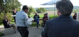 Ein großartiges Dreigestirn des Literaturgeschehens besuchte uns zum Auftakt von „Literatur unter Bäumen“ am 24. Mai 2018: Chrigel Farner, Zeichner und Illustrator, Gion Cavelty, Autor und André Gstettenhofer, Verleger der Verlage „Salis“ und „Lectorbooks“.